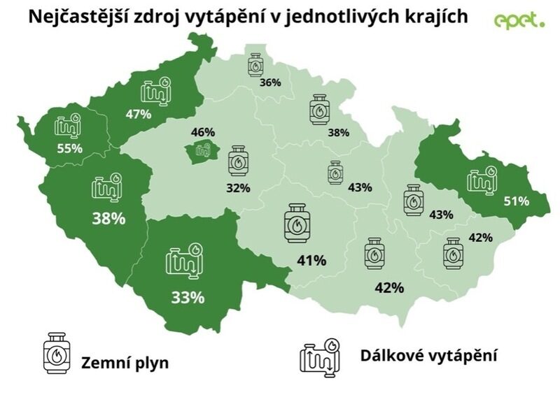 Když se podíváme na to, čím v současnosti české domácnosti topí, stále dominují tradiční a dlouhodobě rozšířené zdroje. Dálkové vytápění využívá zhruba třetina domácností a zemní plyn necelá třetina. S větším odstupem následuje elektřina s 12 % a tuhá paliva z obnovitelných zdrojů, kam patří dřevo, pelety nebo biomasa. Dle průzkumu pak tepelná čerpadla zatím využívá méně než desetina domácností.